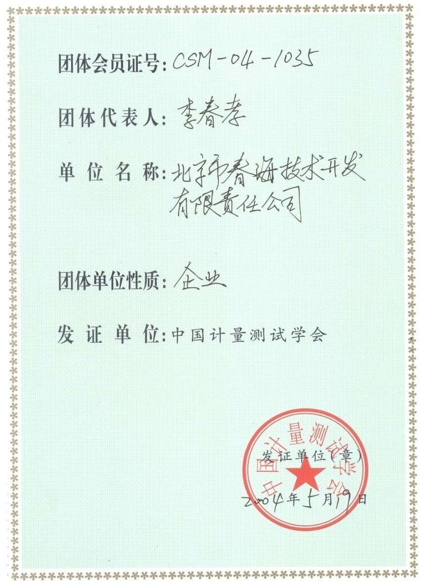 2004年春海公司被选为《中国计量测试协会团体会员》