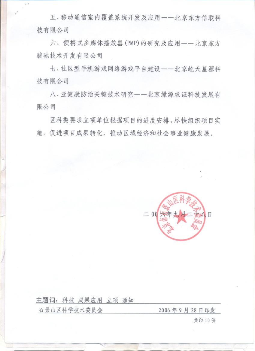 2006年循环链码项目被石景山区科委列为《科技成果应用计划立项》,获支持资金5万元