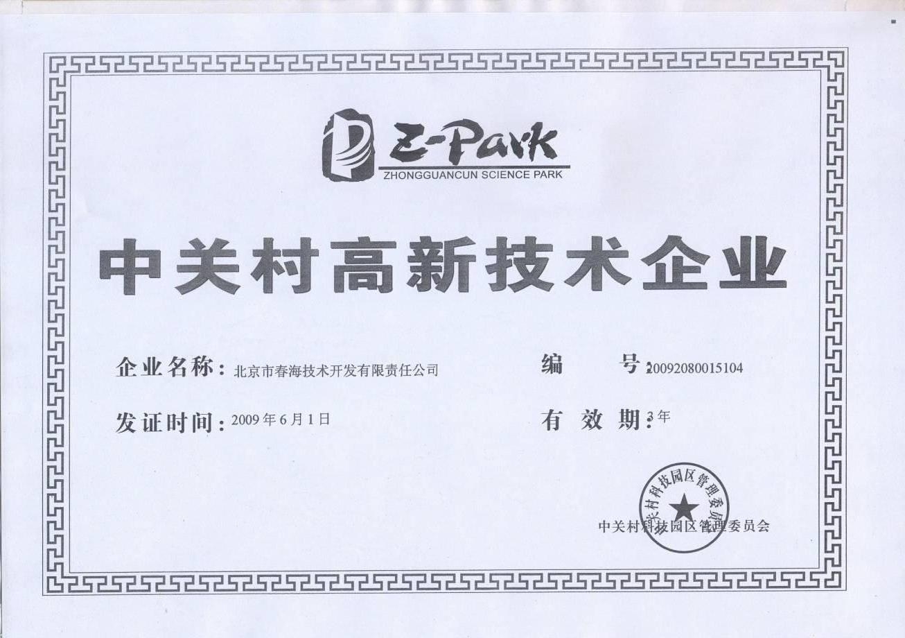 2009年被评为《中关村高新技术企业》